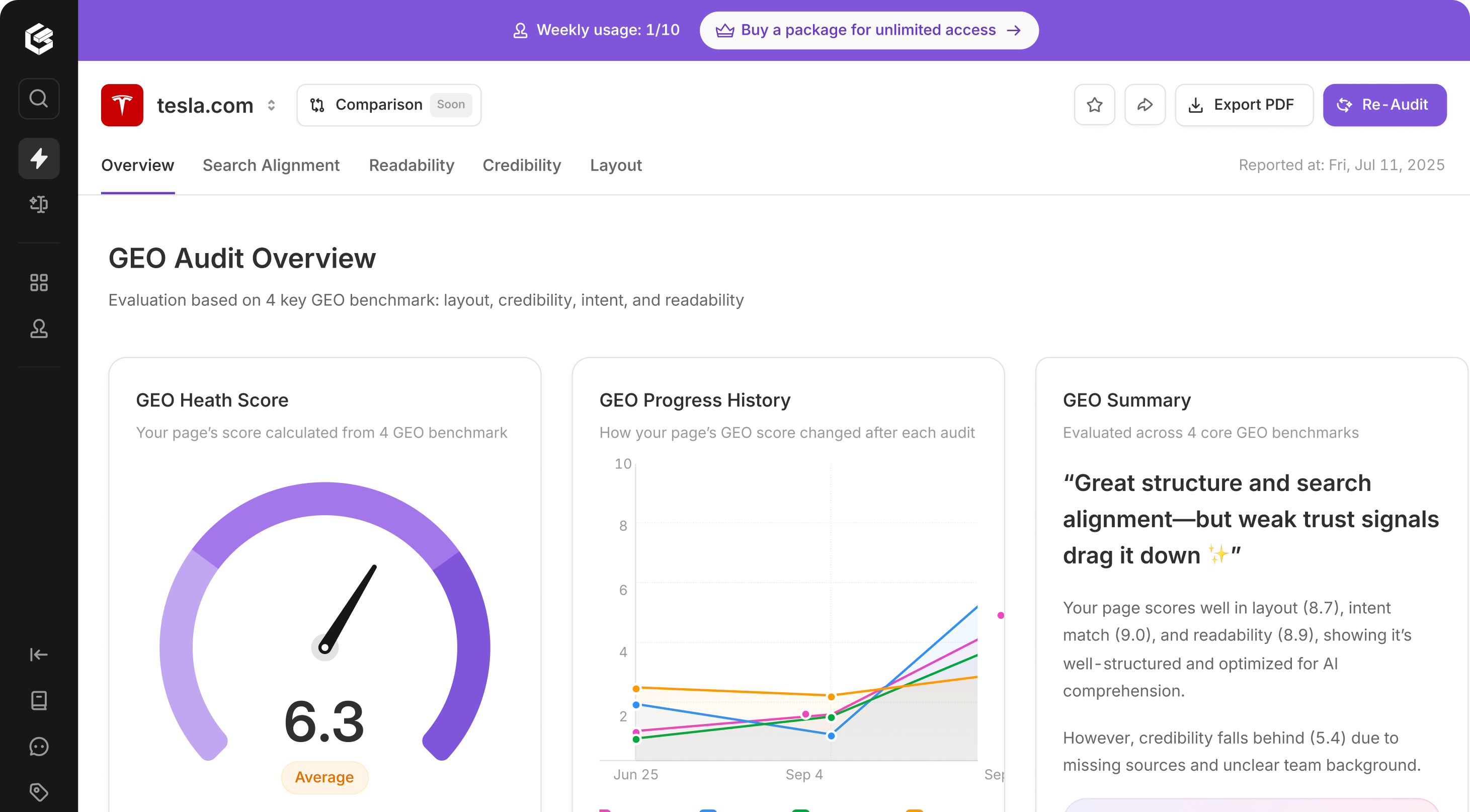 The first audit platform that analyzes and helps you improve your AI brand visibility. GEOReport.ai provides a powerful and comprehensive toolkit to measure Generative Engine Optimization for your website, then delivers clear strategies and actionable steps to improve visibility across ChatGPT, Gemini, Claude, Perplexity, and more.