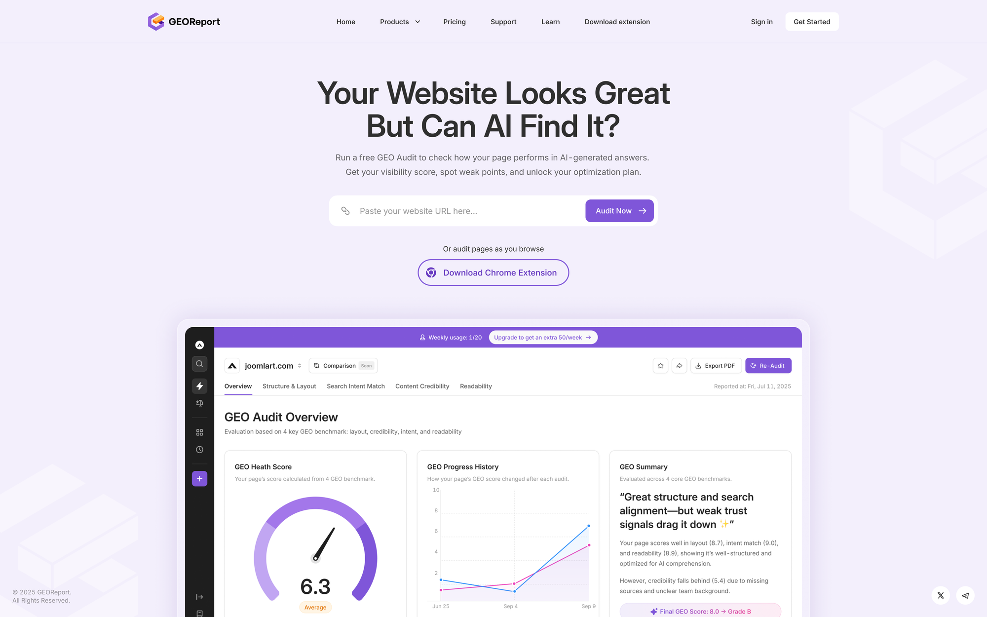 - GEOReport audits these gaps, explaining low visibility due to factors like poor credibility or unreadability. Then provide detailed actionable insights and how-to-fix your website’s issues.