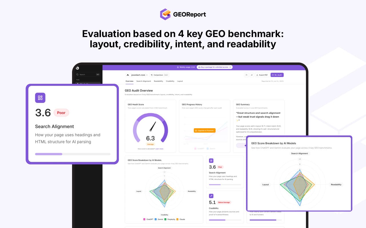 GEOReport measures your site against four key GEO signals: Search Alignment, Layout, Readability, and Credibility. These are the same trust cues AI models like ChatGPT, Gemini, and Claude evaluate before surfacing content in their answers.
