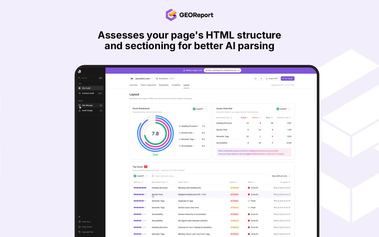 For example, if a page features unstructured text without proper headings, GEOReport identifies it as a layout flaw that could hinder AI parsing. This directly ties into Generative Engine Optimization principles, where well-structured content improves retrieval and citation in AI responses.